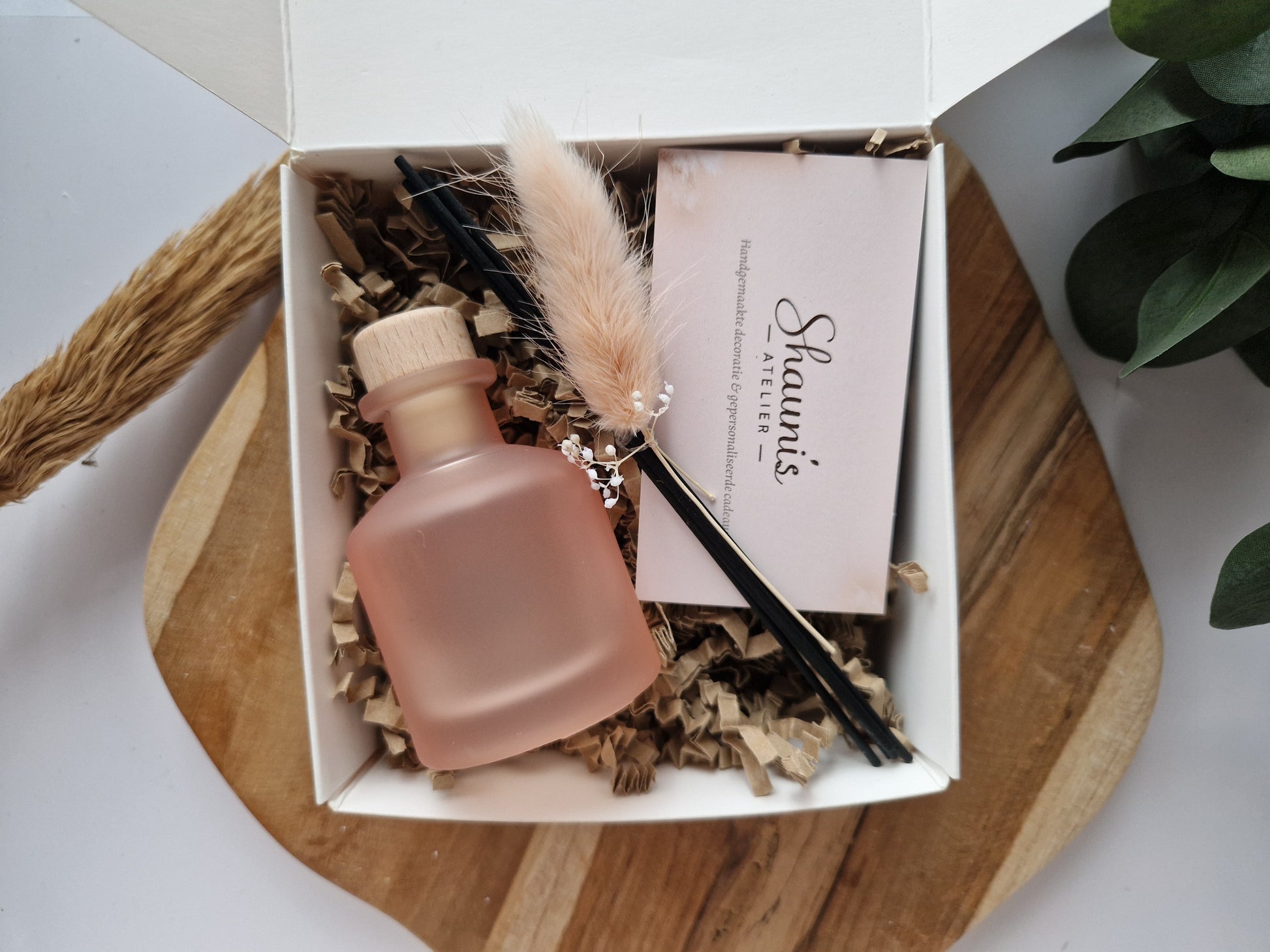 ✔ Geurflesje van 50ml, incl. 5 stokjes (wit of zwart) afgewerkt met kleine droogbloemetjes.